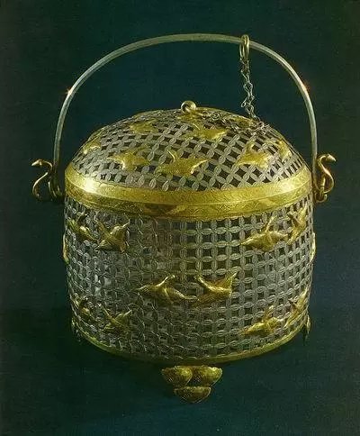 鴻雁球路紋銀籠子,可供作為烘烤餅茶的用器。因唐時,人們飲的是餅茶,飲茶時要將餅茶先進行烘烤后,再經(jīng)碾碎,方可煮茶飲用。
