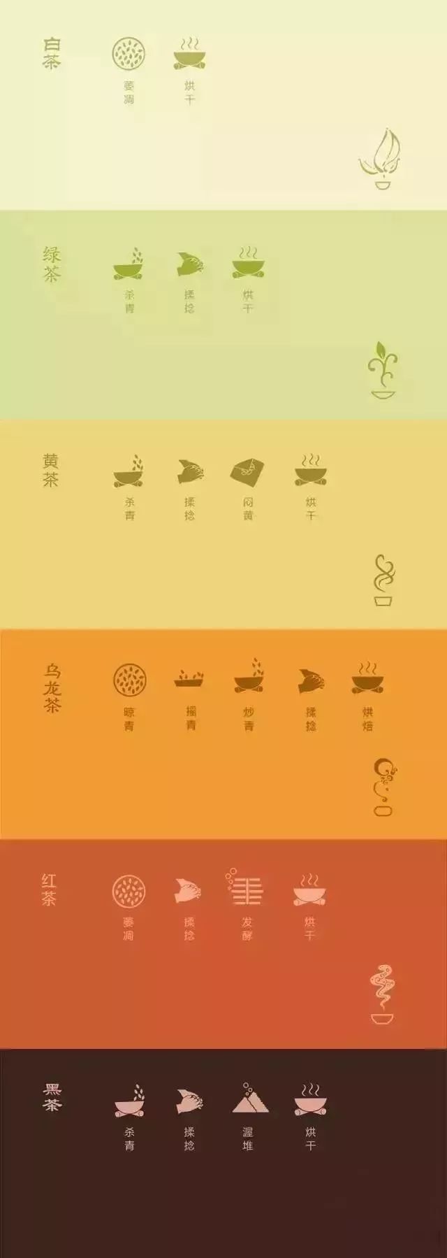 上圖是六大茶類的制作工藝,而事實(shí)上,六大茶類各有一道關(guān)鍵工序,這道關(guān)鍵工序是正是六大茶類分類的標(biāo)準(zhǔn)來源。
