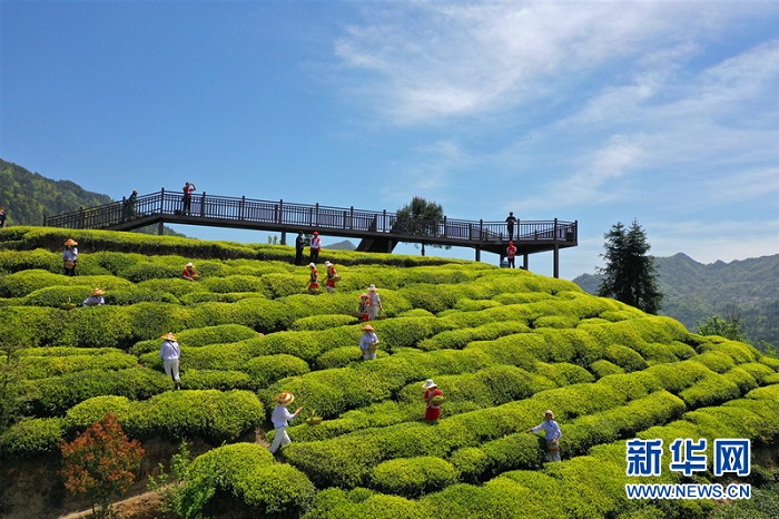 游人在茶園采摘新茶。新華網(wǎng)發(fā) 李重慶 攝