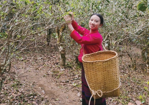 云南省瀾滄縣景邁山糯崗古寨傣族姑娘仙金正在采茶。資料圖