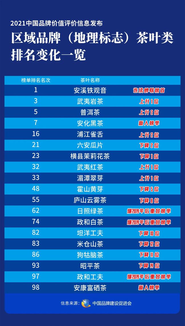 5升8降!2021中國品牌價值評價信息發(fā)布 區(qū)域品牌(地理標志)茶葉類排名變化一覽