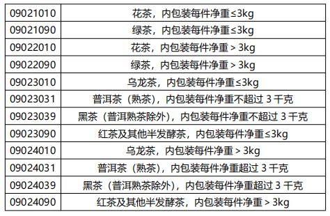 2020年12月,國(guó)務(wù)院關(guān)稅稅則委員會(huì)對(duì)茶葉類(lèi)進(jìn)出口稅號(hào)進(jìn)行了調(diào)整,新增黑茶出口稅號(hào)類(lèi)目,調(diào)整后茶葉進(jìn)出口商品編碼及商品名稱(chēng)信息如下: