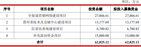 瀾滄古茶原擬在深交所主板公開發(fā)行不超過2000萬(wàn)股人民幣普通股(A股),占公司本次公開發(fā)行后總股本的比例不低于25%。瀾滄古茶原擬募集資金6.28億元,分別用于“全渠道營(yíng)銷網(wǎng)絡(luò)建設(shè)項(xiàng)目”、“普洱茶技術(shù)及倉(cāng)儲(chǔ)中心建設(shè)項(xiàng)目”、“信息化系統(tǒng)建設(shè)項(xiàng)目”、“補(bǔ)充流動(dòng)資金項(xiàng)目”。