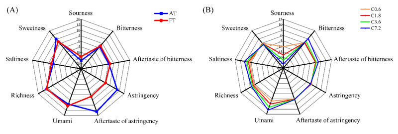 兒茶素,尤其是表沒(méi)食子兒茶素沒(méi)食子酸酯(EGCG)和表兒茶素沒(méi)食子酸酯(ECG)是茶葉苦澀味的最主要來(lái)源。秋茶經(jīng)冠突散囊菌PW-1發(fā)酵后,兒茶素總量從118.35 mg/g下降到10.58 mg/g,下降幅度達(dá) 91.06%;且發(fā)酵秋茶中酯化兒茶素EGCG和ECG的含量分別為0.37 mg/g和0.40 mg/g,表明菌株P(guān)W-1發(fā)酵可顯著降低秋茶中的兒茶素含量。通過(guò)電子舌技術(shù)對(duì)秋茶和冠突散囊菌PW-1發(fā)酵秋茶的滋味特征進(jìn)行分析,發(fā)現(xiàn)秋茶的澀味顯著降低而鮮味強(qiáng)度有所增加,表明秋茶經(jīng)菌株P(guān)W-1發(fā)酵后的滋味品質(zhì)得到顯著提高。此外,通過(guò)電子舌技術(shù)首次對(duì)茶褐素的滋味特征進(jìn)行分析,發(fā)現(xiàn)茶褐素?zé)o澀味而呈強(qiáng)烈的鮮味,為發(fā)酵秋茶中的主要呈味物質(zhì)。