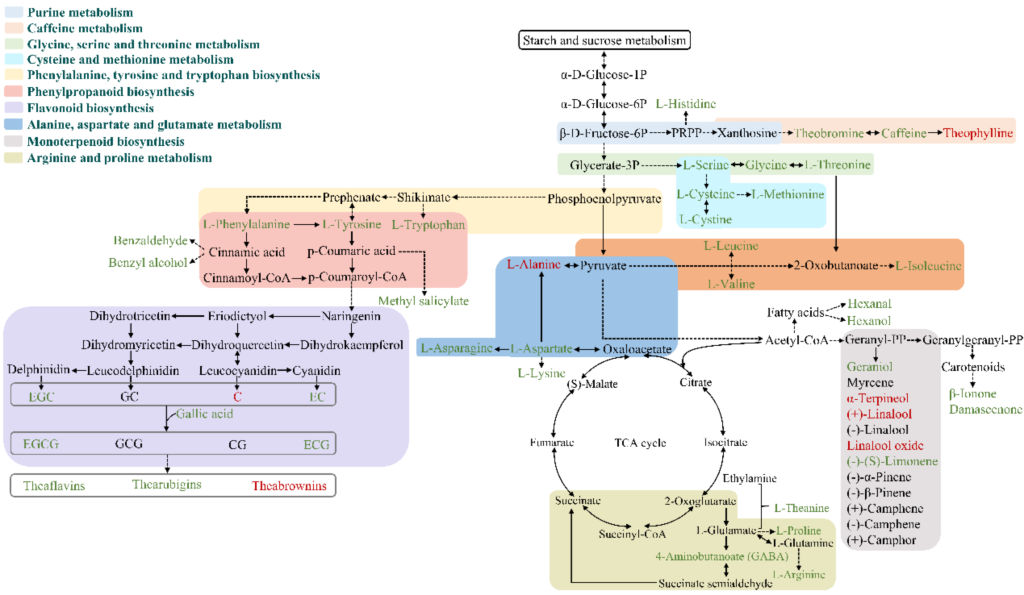 GC-MS分析結(jié)果顯示,秋茶中醇類(lèi)揮發(fā)性成分的含量在冠突散囊菌PW-1發(fā)酵后顯著增加,其中呈花果香味的(Z)-芳樟醇氧化物、芳樟醇、(E)-芳樟醇氧化物(呋喃型)和 1-辛烯-3-醇的含量最高,表明菌株P(guān)W-1顯著提升了秋茶的香氣品質(zhì)。代謝途徑分析結(jié)果顯示,冠突散囊菌PW-1提升秋茶品質(zhì)主要與丙氨酸、天冬氨酸和谷氨酸代謝途徑,甘氨酸、絲氨酸和蘇氨酸代謝途徑,氨酰-tRNA 生物合成途徑,精氨酸生物合成途徑以及精氨酸和脯氨酸代謝途徑的表達(dá)相關(guān)。
